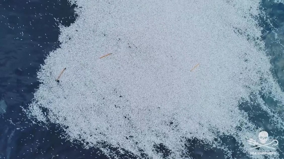 تُظهر صور مجموعة Sea Shepherd فرشة من الأسماك النافقة تطفو على سطح خليج بسكاي على الساحل الجنوبي الغربي لفرنسا، وتقدر بنحو 100 ألف سمكة ميتة.