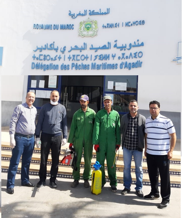 في اطار التفاعل مع الاجراءات الاحترازية و الوقائة ضد تفشي فيروس كورونا بميناء أكادير، و في مبادرة مسؤولة تنم عن الحس الوطني و المهني و الانساني ، انخرطت الجامعة الوطنية للصيد البحري المنضوية تحت لواء الاتحاد المغربي للشغل في حملة تعقيم مقر مندوبية الصيد البحري بأكادير و محيطها بشراكة مع الوكالة الوطنية للموانئ بأكادير.