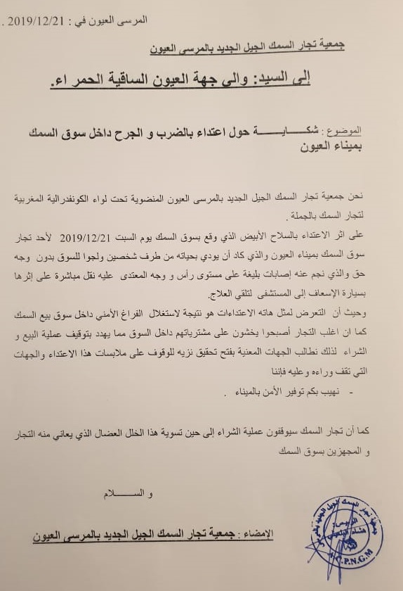 في رسالة وجهتها جمعية الجيل الجديد بميناء المرسى /العيون، إلى كل من والي جهة العيون الساقية الحمراء، والي الأمن بجهة العيون الساقية الحمراء، باشا مدية المرسى، رئيس المجلس البلدي للمرسى/العيون و المدير العام المكتب الوطني للصيد، بخصوص الأحداث التي عرفها سوق السمك للبيع بالجملة بميناء المرسى/ العيون يوم السبت 21 دجنبر 2019 ، على اثر تعرض أحد تجار السمك لاعتداء شنيع بواسطة الضرب و الجرج باستعمال آلة حاذه على مستوى الرأس، تسبب في جرح غائر، نقل على اثره إلى المستشفى، بعدما هاجمه شخصان غير مهنيين، كانا قد تسللا داخل السوق وحاولا سرقة بضاعته، ما اعتبره تجار السمك للبيع بالجملة اعتداء على جميع التجار و تسببا أمنيا غير مقبول ، تفاعلوا معه بالانسحاب الجماعي في خطوة احتجاجية.
