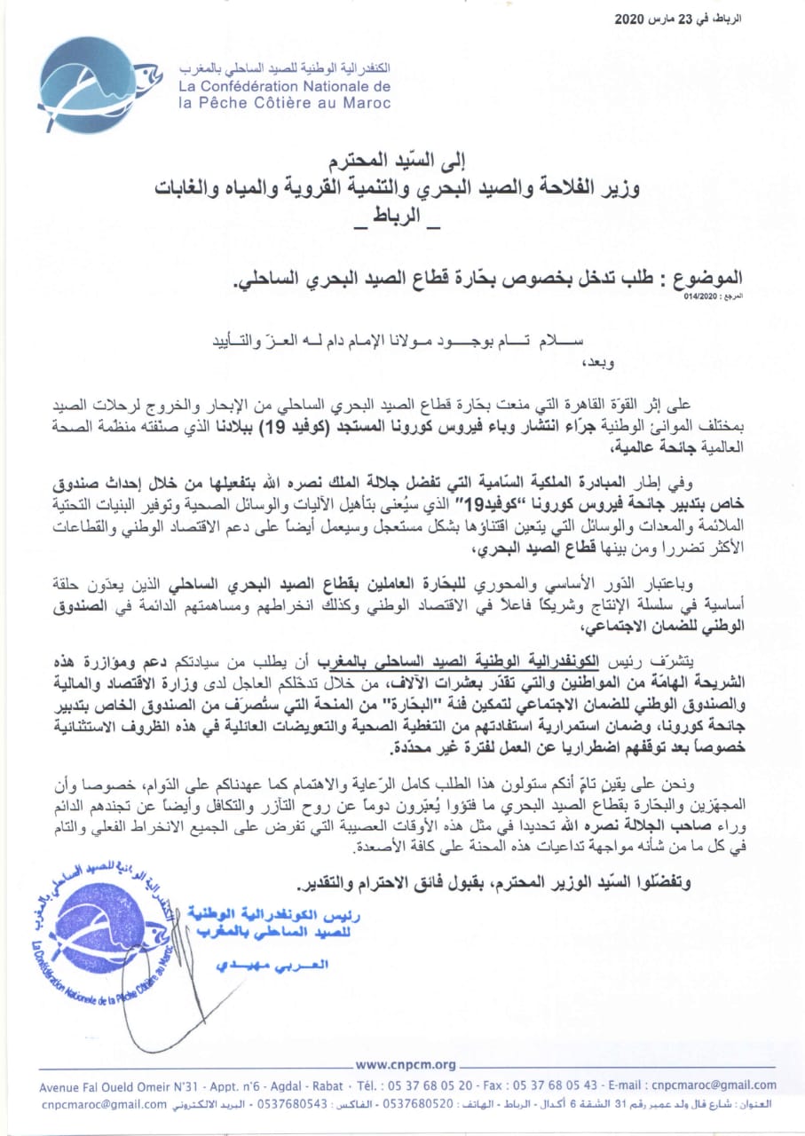 في رسالة لها موجهة الى عزيز أخنوش وزير الصيد البحري ، دعت الكنفدرالية الوطنية للصيد الساحلي الى ضمان استفادتهم من التعويض الاستثنائي الذي برمجته الدولة.