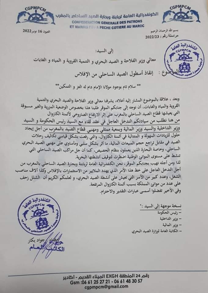 مظاهر الانفصام داخل “الكفندرالية العامة لربابنة و بحارة مراكب الصيد الساحلي بالمغرب” تقول مصادرنا تبرزها رسالة وجهها الكاتب العام الى وزير الصيد البحري عوض الرئيس، ما يعتبر خرقا لأصول البرتوكولات ، يوحي بعدم التقدير الواجب لمقام الوزير.
