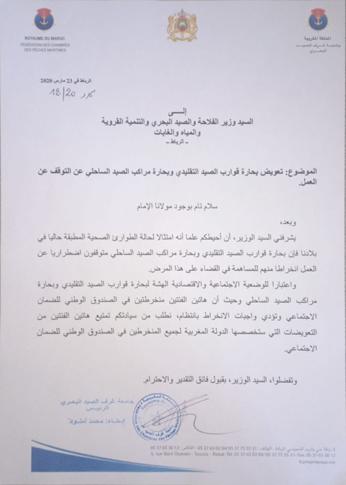 حرصا منها على مصالح بحارة اسطولي الصيد الساحلي و الصيد التقليدي، دعت جامعة غرف الصيد البحري بالمغرب في رسالة لها وزير الصيد البحري الى ضمان استفادة فئة البحارة من التعويضات و المنح الاستثنائية المخصصة لشغيلة القطاع الخاص في اطار مجابهة تداعيات جائحة كورونا، باعتبارهم منخرطين و يؤدون المستحقات بانتظام لفائدة الصندوق الوطني للضمان الاجتماعي.