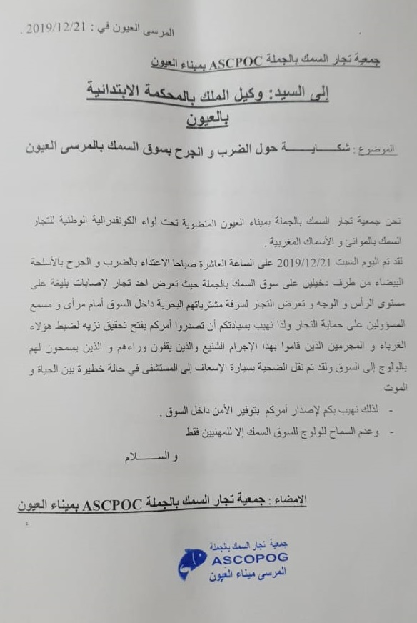 كما دعت الجمعية في رسالتها الموجهة الى كل من والي جهة العيون الساقية الحمراء، الوكيل العام بالدائرة القضائية للعيون والي الأمن بجهة العيون الساقية الحمراء، باشا مدية المرسى، رئيس المجلس البلدي للمرسى/العيون و المدير العام المكتب الوطني للصيد، الكنفدرالية المغربية لتجار السمك بالجملة بخصوص الأحداث التي عرفها سوق السمك للبيع بالجملة بميناء المرسى/ العيون يوم السبت 21 دجنبر 2019 ، إلى فتح تحقيق في ملابسات الحادث و الكشف عن الجهات التي تقف وراءه، على اثر تعرض أحد تجار السمك لاعتداء شنيع بواسطة الضرب و الجرج باستعمال آلة حاذه على مستوى الرأس.
