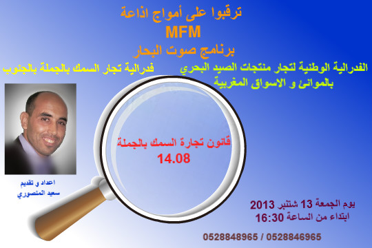 قانون 14.08 أو قانون تجارة السمك بالجملة،موضوع حلقة برنامج “صوت البحار”لمعده الصحفي سعيد المنصوري،الذي تبثه اذاعة ام اف ام على الامواج الوطنية.