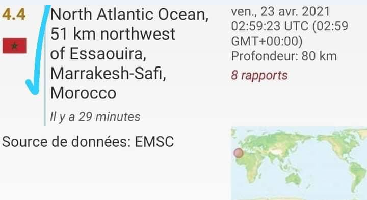 كشف موقع رصد الزلازل في العالم، انه تم تسجيل هزة أرضية بقوة 4.2 درجات على سلك ريتشر اليوم الجمعة للساحل البحري لأسفي والصويرة